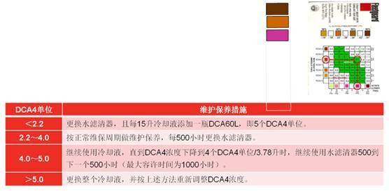 根据检测出的冷却液的DCA4单位,参见下表采取相应维护保养措施;